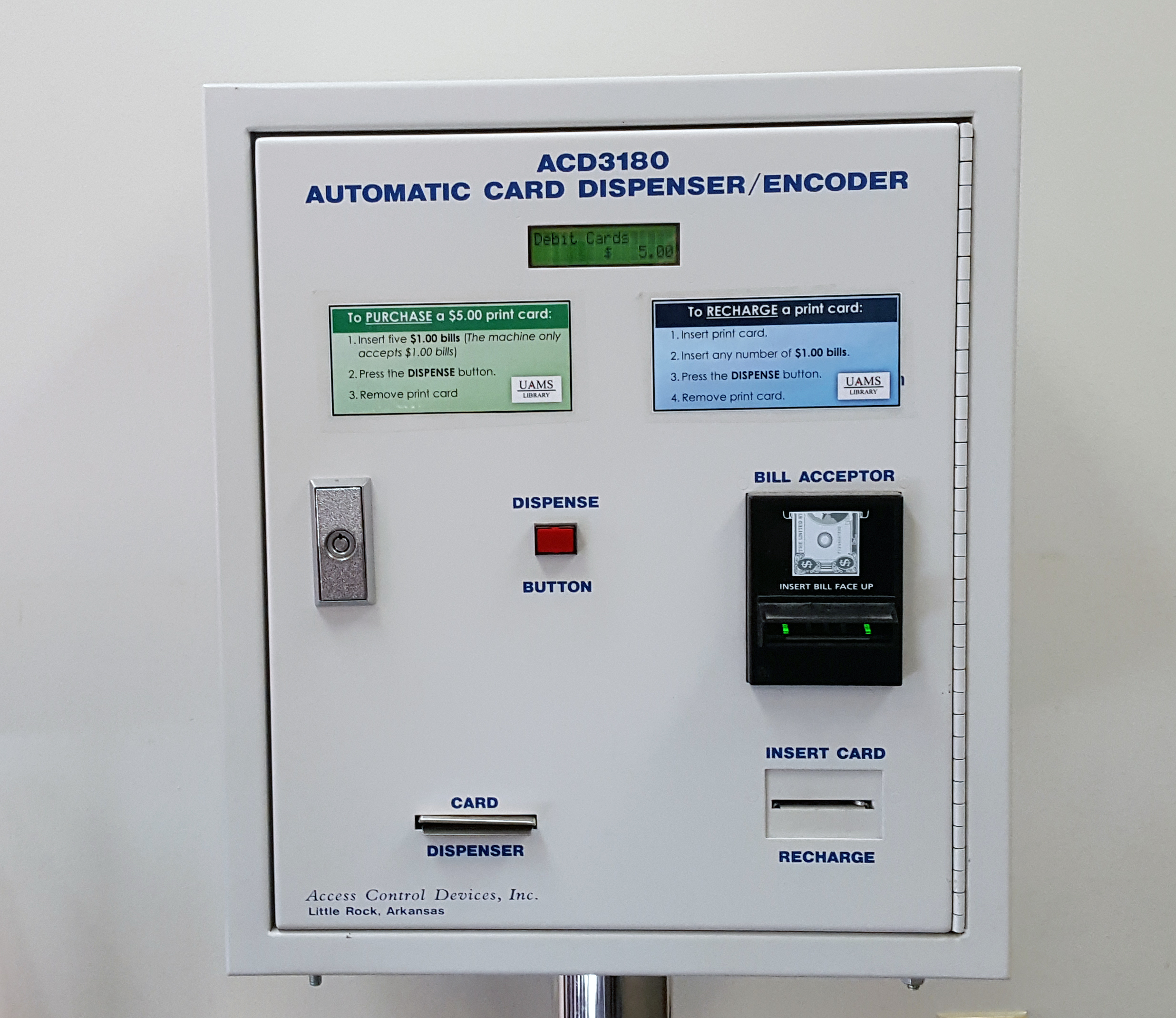 Pay for copies by adding funds to your UAMS ID badge at the Circulation Desk. When you log into a Library computer, you will receive information about how much money is available in your account.